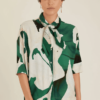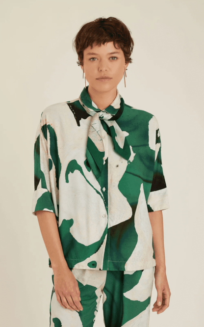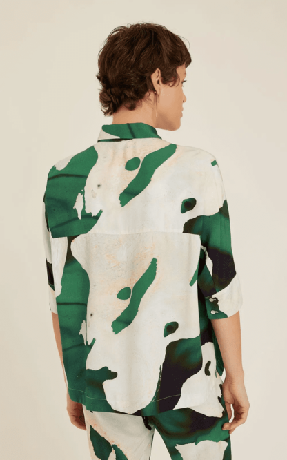 Camisa cropped de botão, com manga na altura do cotovelo e modelagem ampla. A camisa em linho com viscose é perfeita para compor looks do dia a dia. Sua estampa em tons de verde-floresta, tornam a composição do look bem sofisticada.