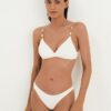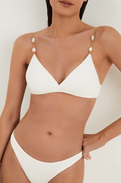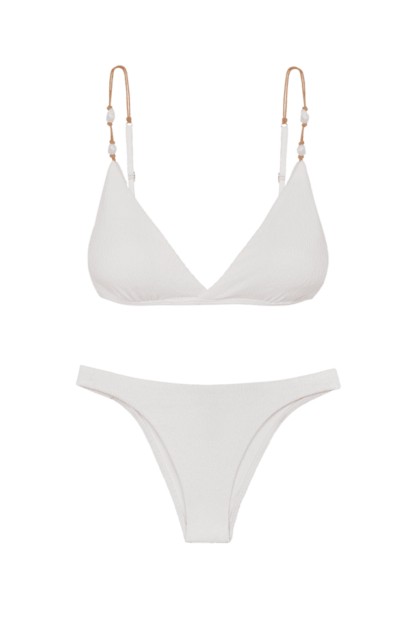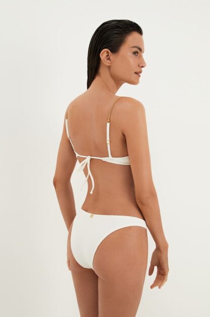 A modelagem Kira tem o top de biquíni branco com decote transpassado e alças paralelas reguláveis, dando maior sustentação.