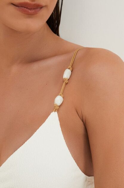 Fresh e delicado, o detalhe Ney tem resinas madrepérola em formatos orgânicos e corda elástica bege.