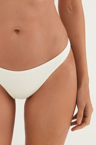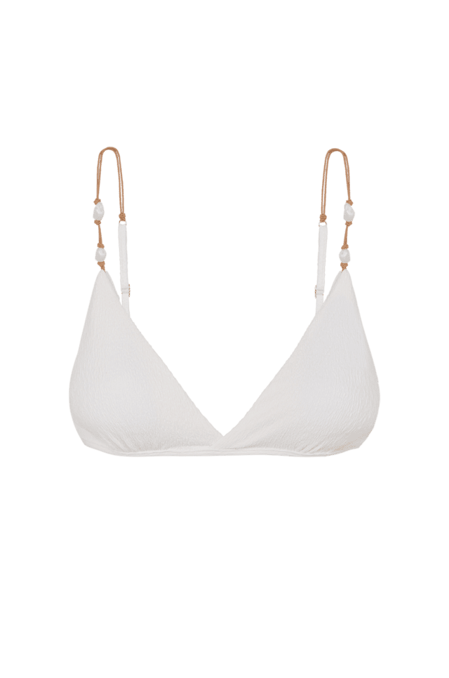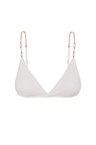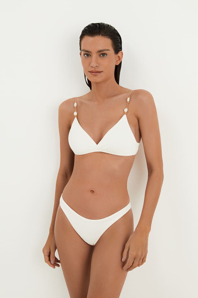 A modelagem Kira tem o top de biquíni branco com decote transpassado e alças paralelas reguláveis, dando maior sustentação.