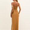 Vestido midi Bel Det Toffee em linho com decote quadrado, detalhe dourado, alças ajustáveis e fenda frontal — sofisticação e conforto para ocasiões especiais.